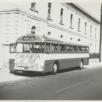 Autobus "Caravana de don Rodrigo" y al fondo el edificio que hoy ocupa el Archivo General de Puerto Rico.