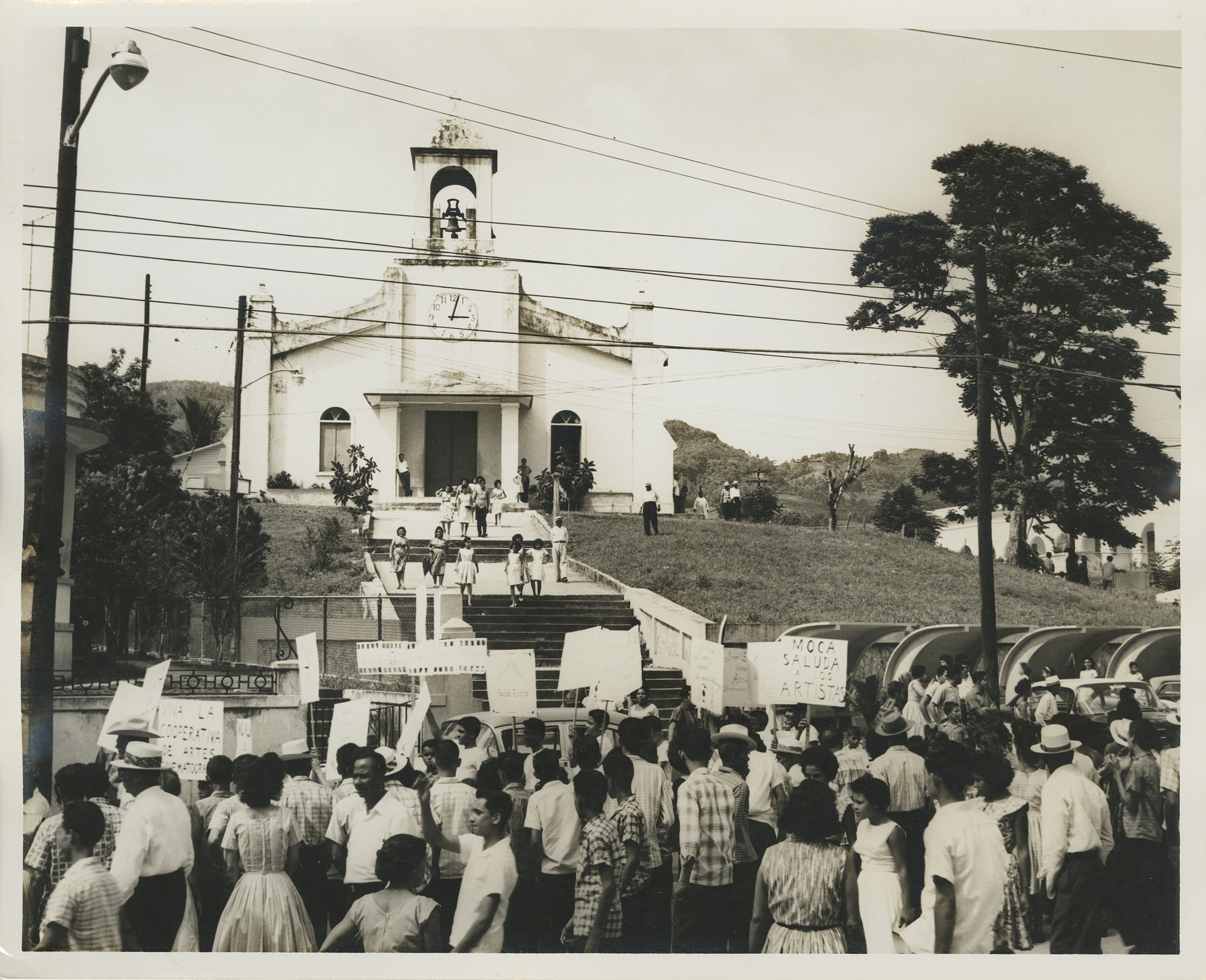 Vista de la iglesia católica de Moca y una multitud de ciudadanos saluda al elenco del filme "Más allá del Capitolio" con cartelones de bienvenida