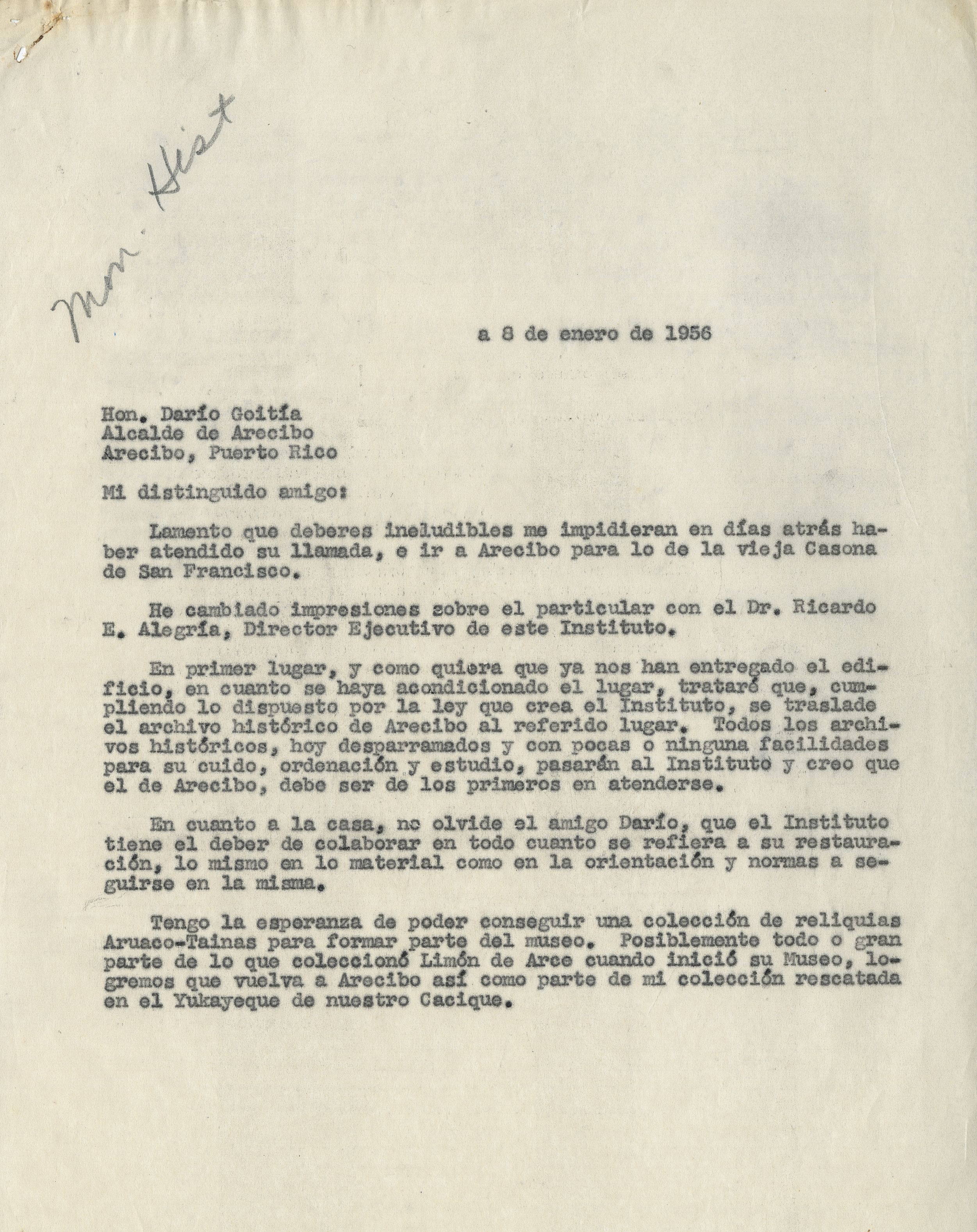 Carta del Dr. José R. Oliver al Alcalde de Arecibo, Hon. Darío Goitía del 8 enero 1956