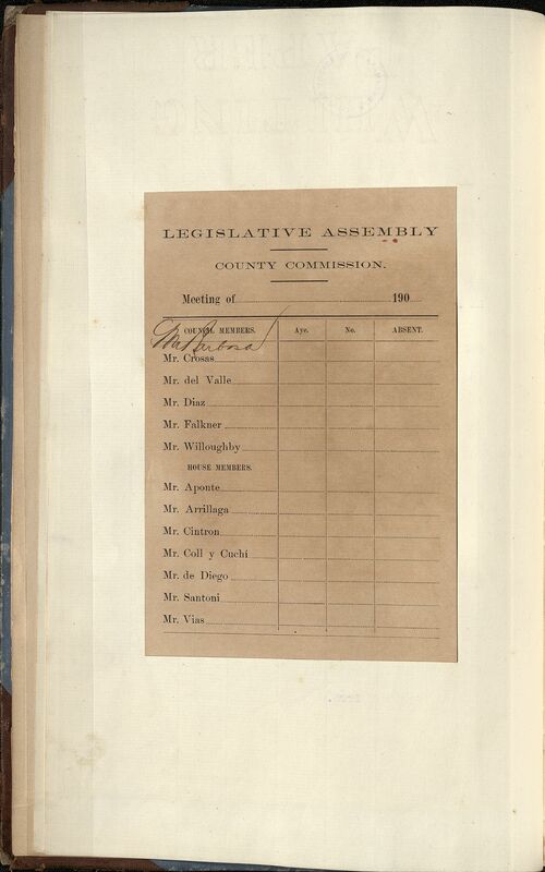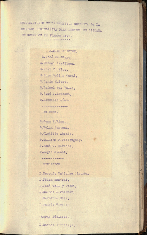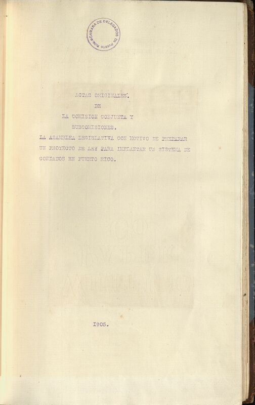 Actas originales de la Comisión Conjunta y Subcomisiones. La Asamblea Legislativa con motivo de preparar un proyecto de ley para implantar un sistema de Condados en Puerto Rico, 1905.