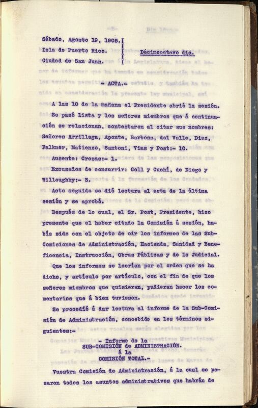 Abrió la sesión a las 10:00 de la mañana, se pasó lista, estuvieron presentes Arrillaga, Aponte, Barbosa, del Valle, Diaz, Falkner, Matienzo, Santoni y Post. Crosas estuvo ausente y fueron excusados Coll y Cuchí, de Diego y Willoughby. Se dio lectura al acta de la última sesión y fue aprobada.