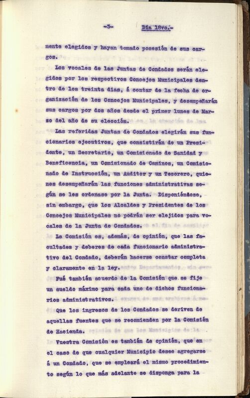 - Que las Juntas elijan un Presidente, un Secretario, un Comisionado de Sanidad y Beneficencia, un Comisionado de caminos, un Comisionado de Instrucción, un Auditor y un Tesorero; los Alcaldes y los Presidentes de los Concejos Municipales no podrán ser elegidos para vocales de la Junta de Condados.