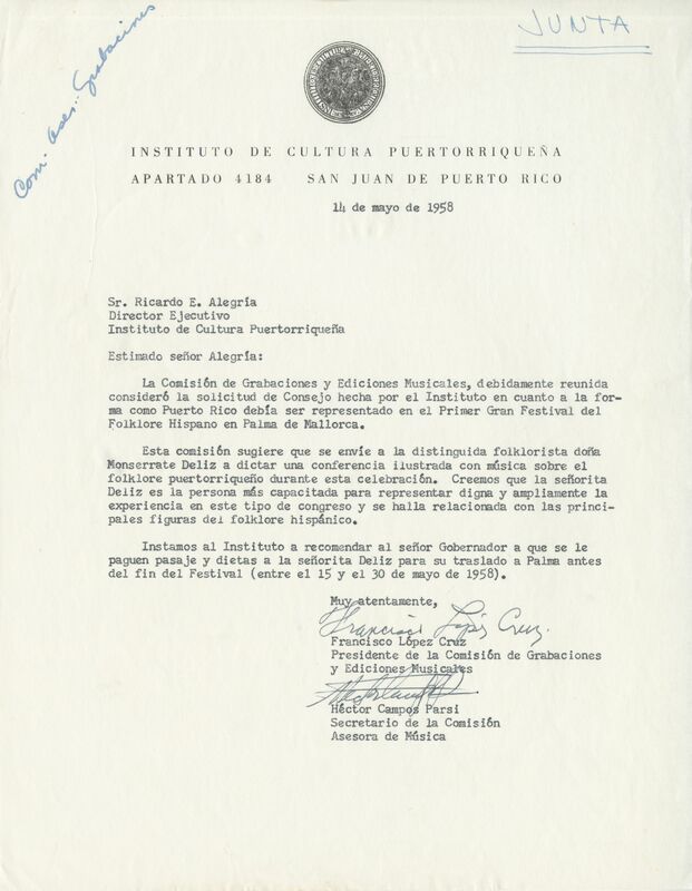 Solicitud del Presidente de la Comisión de Grabaciones y Ediciones Musicales y del Secretario de la Comisión Asesora de Música a Ricardo Alegría para recomendar se destaque a Monserrate Deliz en el Primer Gran Festival del Folklore en Palma de Mallorca en representación de Puerto Rico