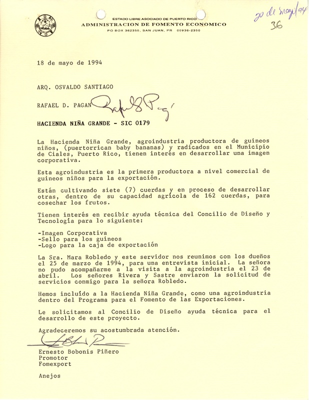En los expedientes de diseño gráfico, se puede apreciar proyectos de empresas y organizaciones de Puerto Rico con gran variedad de artes gráficas, como lo son etiquetas de comida, posters de películas, carteles, logos, entre otros. Aquí mostramos algunos diseños de logotipos y sus usos para la Hacienda Niña Grande en Ciales.